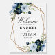 A geometric design with painted navy and light blue watercolor flowers. The text and colors on this wedding sign poster can be edited.