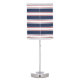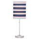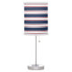 Light up your space in summery nautical style with our classic striped table lamp, featuring wide horizontal navy blue stripes flanked by thinner bands of deep red on a crisp white background. Shown with dark blue trim.