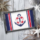 A bright crisp nautical design in navy and red embellished with an anchor and life preserver.