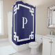 Decorative navy and white Greek key style border and modern serif monogram shower curtain.