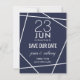 A clean contemporary design in navy blue and white with minimalist appeal, this wedding Save the Date Card conveys your wedding plans with modern style. White geometric lines surround your text over a navy blue background. Bold numbers are used to accentuate the date of your wedding. Personalize the sample text in the design template with your wedding date, the bride and groom's names and the city location of your wedding. The reverse side of the card is shown in the same navy blue color as the front. You can add additional text on the back if you wish (i.e. your wedding website or other desired comments), or simply leave the back as is.