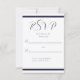 An Elegant Navy and White Wedding Reply Card for your Wedding Invitation package. Designed with navy text and trim, the front side text includes: RSVP, Your Respond By Date, as well as space for guests to include their names. The reverse side is a classic navy background. To personalize, simply replace the sample text using our easy template. Be sure to view the entire Navy and White Floral Leaf Wedding Collection for matching stationery.