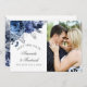 Navy and white flowers wedding save the date photo cards with accents of silver foil.