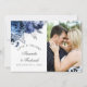 Navy and white flowers wedding thank you photo cards with accents of silver foil.