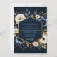 A dramatic navy backdrop is adorned with a lavish display of creamy white and soft blue blossoms. Golden accents add a touch of sparkle amidst lush foliage and delicate floral sprays. This design evokes a feeling of refined opulence for a memorable occasion.