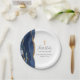 The left-hand edge of this elegant paper plate features a navy blue watercolor agate border trimmed with faux gold glitter. A faux gold foil cross appears above the customizable text, which combines handwriting, copperplate and italic fonts in charcoal gray on a white background. Personalize it with the name of the guest of honor and the date.