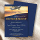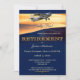 Retirement party invitation featuring an image of an airplane taking off to freedom. The background is navy blue with a slight texture (printed) and a gold stylized bottom ornament.