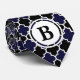 A stylish and customizable neck tie, featuring a navy blue and black quatrefoil pattern and monogram circle at the bottom where you can type in your initial or any other text. Suitable for any formal occasion. Makes a unique gift for stylish dudes!