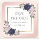 Navy blue and blush wedding save the date coasters featuring a gold frame decorated with roses. Matching items available.