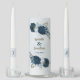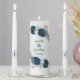 Beautiful romantic wedding unity candle set featuring navy blue and light dusty blue flowers and some pretty leaves .