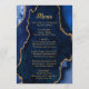 Create a striking presentation with this navy blue and gold agate marble menu, perfect for wedding receptions and versatile enough for stylish multi-purpose use. Deep midnight blue tones, organic stone-inspired textures, and shimmering gold accents come together to create a refined yet dramatic look that pairs beautifully with fall or winter celebrations. Designed to complement elegant, modern, and glamorous events, this agate-inspired menu can be customized for wedding dinners, cocktail hours, dessert tables, or upscale event and restaurant menus, offering timeless sophistication that extends well beyond the wedding day.