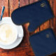 This personalized set is simple, sophisticated and elegant. It features a navy blue background with a gold monogram and script typography for your personalization. Colors can be customized to your choosing