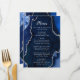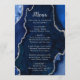 Create a striking presentation with this navy blue and silver agate marble menu, perfect for wedding receptions and versatile enough for stylish multi-purpose use. Deep midnight blue tones, organic stone-inspired textures, and shimmering silver accents come together to create a refined yet dramatic look that pairs beautifully with fall or winter celebrations. Designed to complement elegant, modern, and glamorous events, this agate-inspired menu can be customized for wedding dinners, cocktail hours, dessert tables, or upscale event and restaurant menus, offering timeless sophistication that extends well beyond the wedding day.