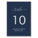 Personalized navy blue and silver wedding table number card featuring a modern script font. Matching items available.