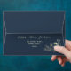 Simple, modern, calligraphy terracotta and navy blue wedding invitation 5x7 envelope with return address and gold floral lace.