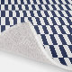 Bold geometric pattern of navy blue and white squares form a checkered pattern.
