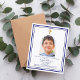 A white background, decorated with a navy blue frame, and a golden cross Personalize and add a photo name and details. Navy blue text. Arch shaped photo frame.