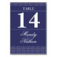 Graphic wedding table number card in dark blue and white. A great idea to help guests find their seats at your wedding. Personalize with your names and wedding date. Original design by Sarah Trett.