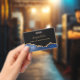 A unique version of an abstract navy blue black and gold foil agate event and wedding planner business card featuring an elegant script signature. in a trendy chic style. Select your preferred style of attachment from the menu on the right, or no attachment.