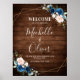 Dark navy blue floral geometric wedding welcome poster featuring elegant bouquet of navy blue, royal blue , white , blush rose and sage green eucalyptus leaves and elegant glitter geometric neutral frame on rustic wood background. Please contact me for any help in customization or if you need any other product with this design.