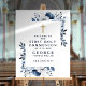 This modern elegant navy blue floral first holy communion welcome sign can be personalized with your information in modern navy typography. Designed by Thisisnotme©