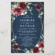 Design features a dark navy watercolor wash printed background with a printed gold colored geometric or terrarium frame covered in elegant eucalyptus and greenery leaves/branches. Beautiful peony and rose floral elements in shades of burgundy, red, Marsala and more with hints of blush pink flowers appear over the greenery.