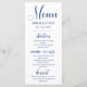 Minimalist wedding menu in white with navy blue calligraphy text and elegant fonts. Personalize with your names and wedding date. The back features a classic tiled pattern in matching colors.