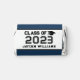 Personalized boy's graduation party favors with the year or class of 2026 and the graduate's name. Design featuring a high school or college grad cap with a navy blue background.