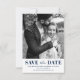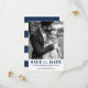 Navy Blue Classic Typography Photo Save the Date Announcement. Customizable save the date announcement featuring blue classic typography and stripes back pattern. Personalized by adding your own photo and details. Other colors are available.