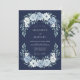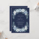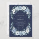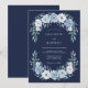 This design features a deep midnight navy backdrop that beautifully contrasts with delicate watercolor florals in shades of icy blue and white. Clusters of soft roses, anemones, and lush foliage create an elegant botanical arrangement. The cool-toned palette evokes a serene winter atmosphere, perfect for a sophisticated evening affair.