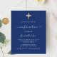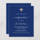 A modern, elegant and invitation. A navy blue background decorated with a golden cross. Personalize and add a name and details. White text.