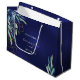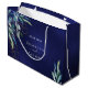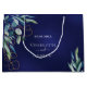A naby blue background. The blue color is uneven. Decorated with watercolored eucalyptus greenery, and golden foliage. Personalize and add a date and the name of the bride and groom. White text.