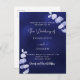 Navy blue background, decorated with eucalyptus stems, sprigs. The blue color is uneven. Personalize and add your names and the details.