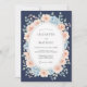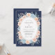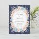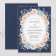 This design features a deep navy blue backdrop for soft peach roses and dusty blue hydrangeas. The romantic color palette is complemented by lush greenery and delicate white sprigs. It evokes an elegant and timeless mood, perfect for a sophisticated seasonal event. The artwork showcases a dense floral arrangement with a soft, painterly watercolor finish.
