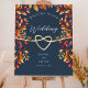 Greet your guests with a perfect mix of rustic charm and boho elegance with this navy blue and burnt orange fall wedding welcome sign. Featuring a romantic gold rope heart and vibrant watercolor autumn leaves, this beautiful design brings the ideal pop of color and warmth to your autumn celebration. Enhance your special day with this stunning, stylish welcome sign that radiates both charm and personality!
