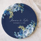 Elegant blue and white roses decorate this beautiful floral evening paper plate. The chic typography is accented with pretty indigo watercolor flowers and a lovely light yellow botanical sprig. The couple's names are written in classic white cursive script on this modern winter reception decor for a contemporary bride.