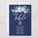 Bold navy blue and white peony floral evening wedding table number card for a modern winter wedding. An elegant botanical spray of green leaves unfolds above trendy handwritten white script for a gorgeous modern event seating chart.