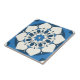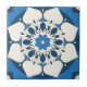 A modern tile featuring a geometric floral star design in navy and blue colors with ivory. Beautiful for kitchen or bathroom!