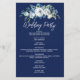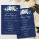 Bold navy blue and white peony floral evening wedding program for a modern winter wedding. An elegant botanical spray of green leaves unfolds above trendy handwritten white script for a gorgeous modern event.