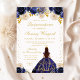 This elegant and glamorous Quinceañera birthday postcard features a beautiful princess with dark hair in a tiara and navy blue ball gown. The text combines handwritten script and modern sans serif fonts for a classy and sophisticated look. The floral arrangements and gold confetti create the perfect blend of rustic and chic.