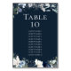 This elegant and chic navy blue wedding seating chart table number card features blue, green, white and silver gray watercolor botanicals on top of a deep blue background.