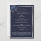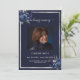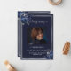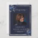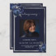 An elegant 2-page program. A dark blue background, a faux silver frame, blue florals and space for a photo. Personalize and add name, dates and your text.