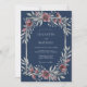 This design features a deep navy blue background that creates a striking contrast with the delicate dusty rose florals. Silver-grey foliage and white berries are arranged in an elegant display, evoking a chilly seasonal aesthetic. Muted tones of mauve and slate provide a sophisticated and formal mood for a winter event.