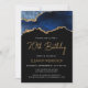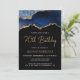 This elegant 70th birthday party invitation features a watercolor image of an agate geode in shades of blue with faux gold glitter highlights. The words "70th Birthday" appear in gold-colored modern handwriting script. Customize it with the name of the honoree in gold-colored text and the details in white on a black background. A matching navy blue and gold agate design appears on the reverse side.