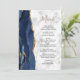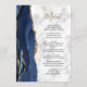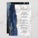 The left-hand edge of this elegant modern wedding menu features a navy blue watercolor agate border trimmed with faux gold glitter. The customizable text combines gold-colored handwriting script and black copperplate font on gray and white marble background. The reverse side features a matching navy blue and gold agate design.