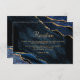 This modern luxury wedding reception card features a chic trendy navy blue and gold agate gemstone background, with an elegant script monogram of the bride and groom on the back.