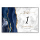 The left-hand edge of this elegant modern wedding table number card features a navy blue watercolor agate border trimmed with faux gold glitter. The customizable text combines black and gold handwriting, italic and copperplate fonts on a gray and white marble background.