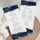 This elegant, modern wedding program features navy blue watercolor agate top and bottom borders trimmed with gold faux glitter. The text appears in elegant charcoal gray handwriting and copperplate fonts on a white background.