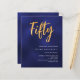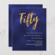 A modern, stylish invitation for a 50th birthday party for both him and her. The blue color is uneven. Navy blue background and the word Fifty written with large faux gold letters. Personalize and add a name and party details. White text.