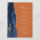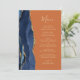 The left-hand edge of this elegant modern wedding menu features a navy blue watercolor agate border trimmed with faux gold glitter. The customizable text combines gold-colored handwriting script and copperplate fonts on a burnt orange background. The reverse side features a matching navy blue and gold agate design.